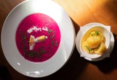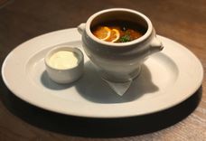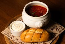 250/50/75/2 г • Суп приготовлен по традиционному рецепту на основе свеклы, говяжьей вырезки. Подаём с чесночной булочкой и сметаной